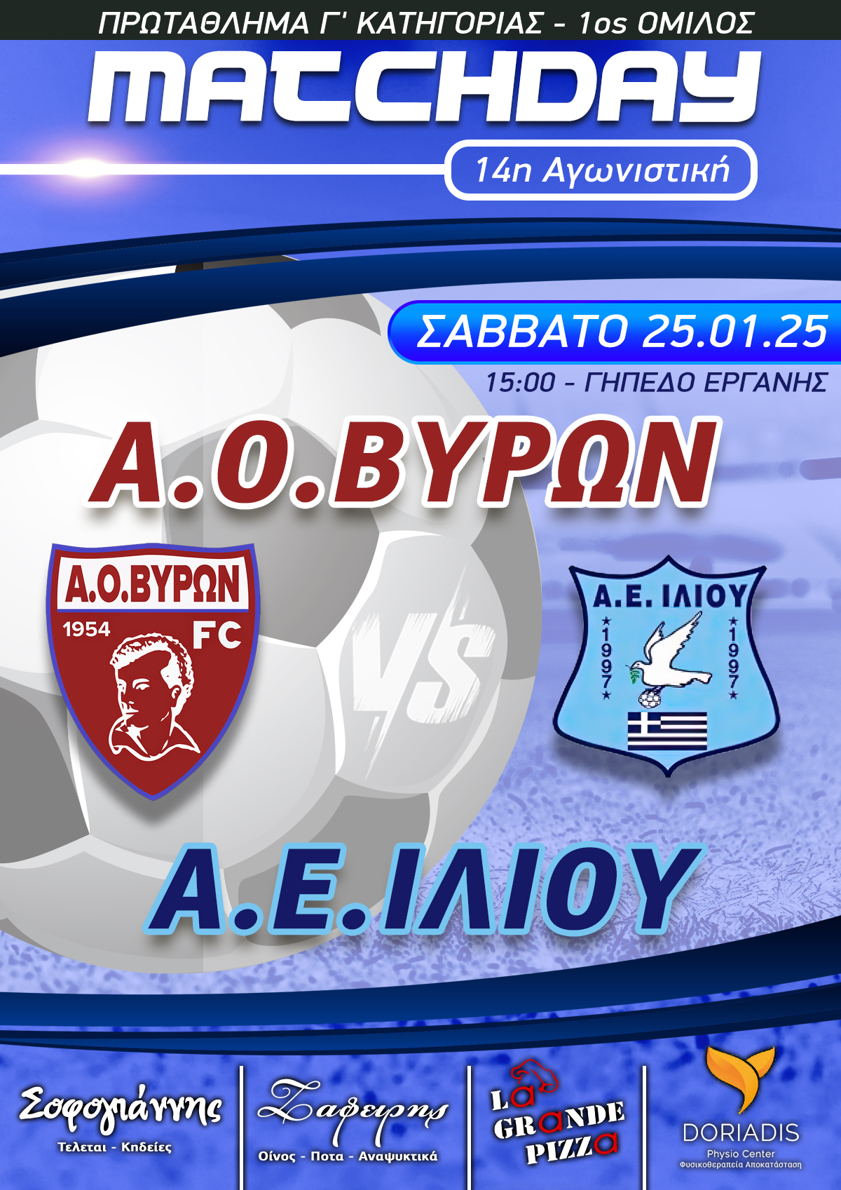 ΕΠΟΜΕΝΗ ΑΓΩΝΙΣΤΙΚΗ : Α.Ο.ΒΥΡΩΝ - Α.Ε.ΙΛΙΟΥ ΣΑΒΒΑΤΟ 25/01/2025 ΩΡΑ 15:00 ΓΗΠΕΔΟ ΕΡΓΑΝΗΣ