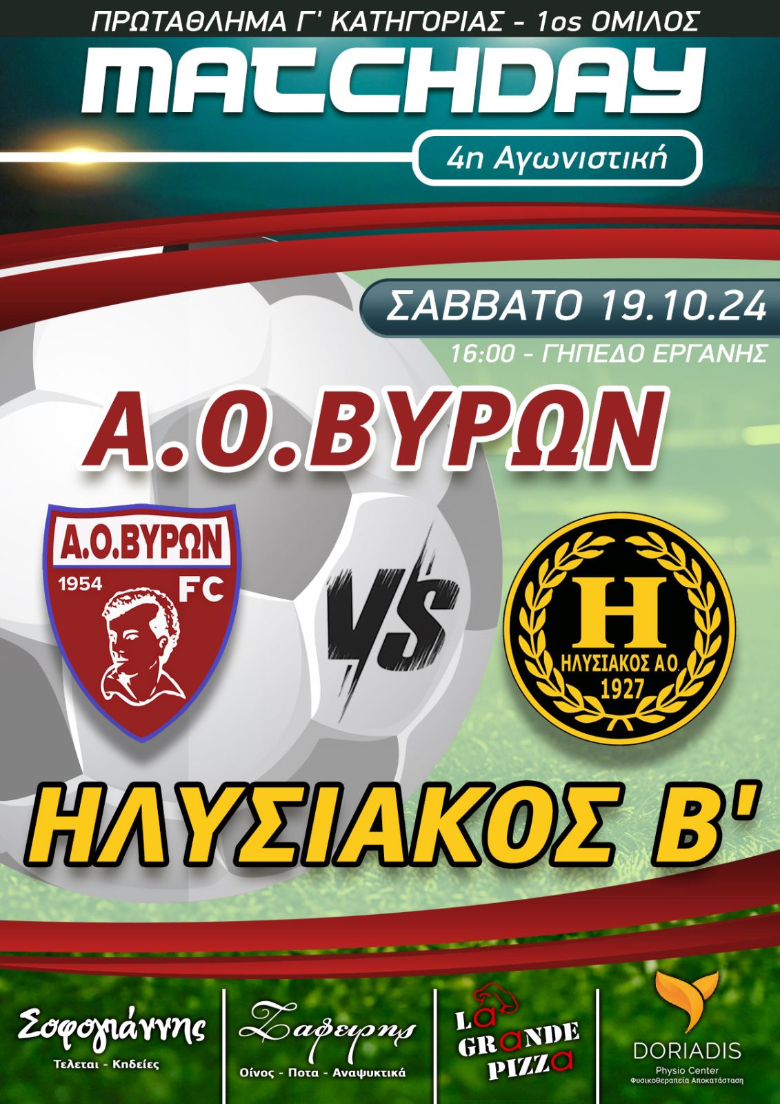 ΕΠΟΜΕΝΗ ΑΓΩΝΙΣΤΙΚΗ : Α.Ο.ΒΥΡΩΝ - ΗΛΥΣΙΑΚΟΣ ΣΑΒΒΑΤΟ 19/10/2024 ΩΡΑ 16:00 ΓΗΠΕΔΟ ΕΡΓΑΝΗΣ